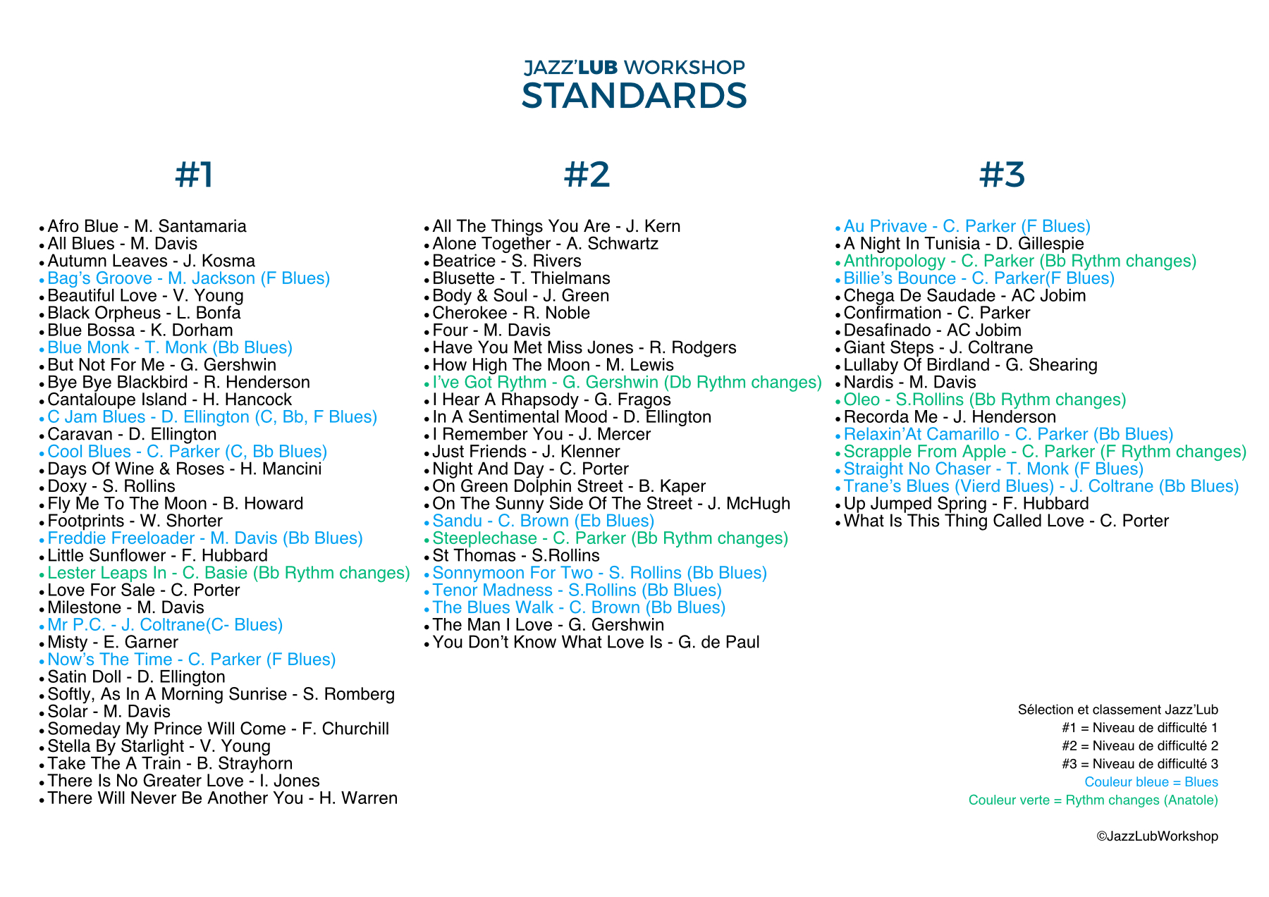 À titre indicatif, voici la sélection Jazz’Lub de standards recommandés parmi les plus emblématiques, les plus appréciés et les plus joués lors des jam sessions, classés par difficulté 1 à 3 (liste non-exhaustive) :